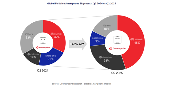 CounterPoint Research分析师表示,中国可折叠智能手机市场仍然强劲,其中华为是主要驱动力,尤其是华为Mate X6,在2025年第二季度出货量占华为折叠屏手机的三分之一以上,最受消费者青睐。